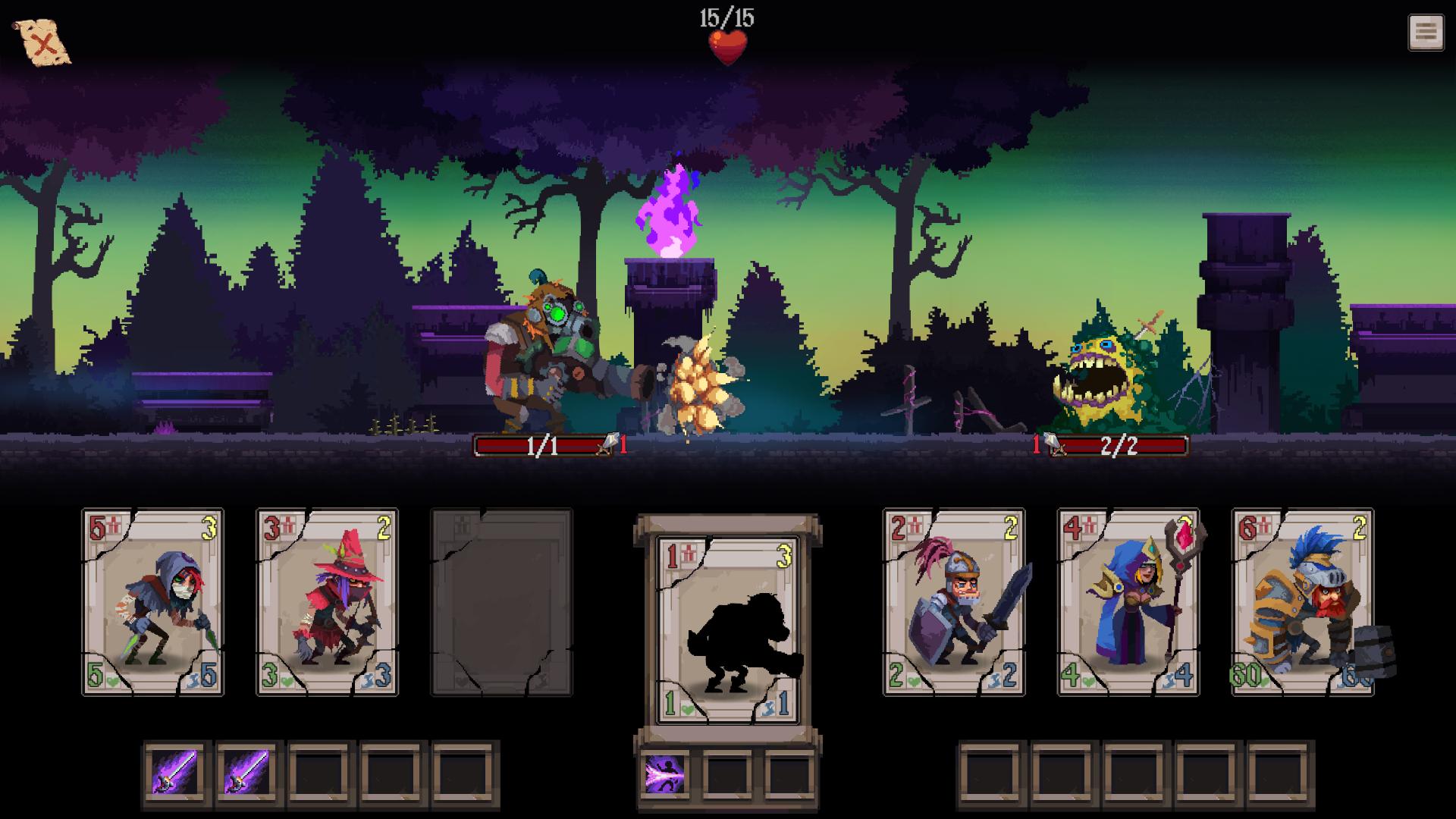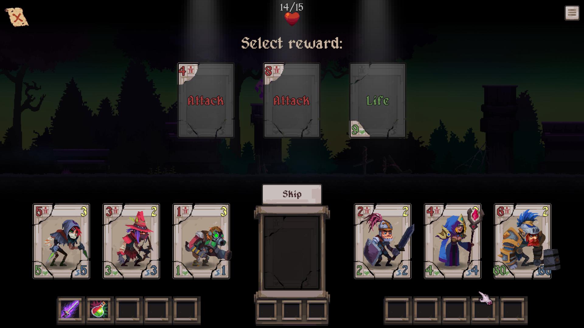 The extra abilities you can grab, while powerful, also felt unbalanced. Specifically the one that reduces enemy attack since, as I said, your heroes surviving for longer is extremely important. Also might have found a bug, the skeleton that increases its own attack would bring it to "it's original attack + 1", even when debuffed